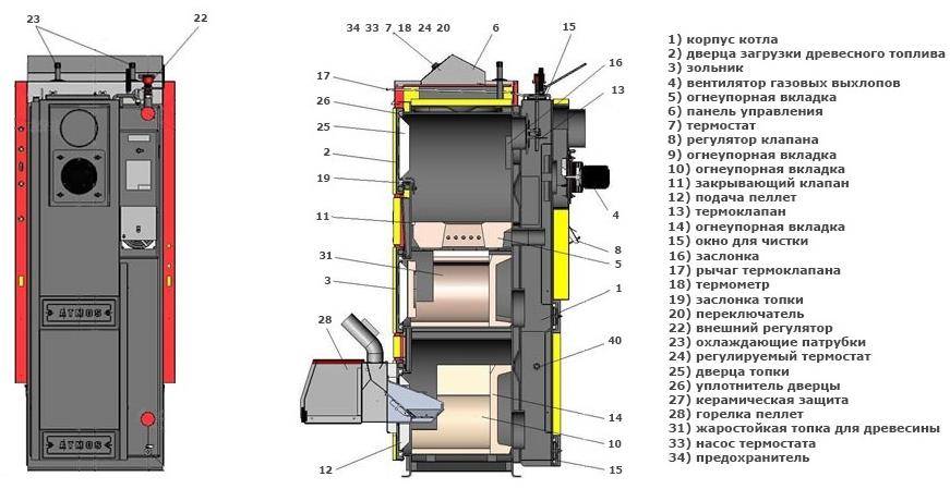 - Дровяную топку устанавливают в нижней части. Там размещают зольник и колосниковую решетку. Герметичную камеру сгорания в этих моделях располагают над топкой. Две камеры соединены общим дымоходом. Однако отверстия в дымоходе открываются только во время работы определенной камеры. Патрубок из нерабочей топки на это время перекрывает специальная заслонка. Ее работой можно управлять автоматически или вручную.