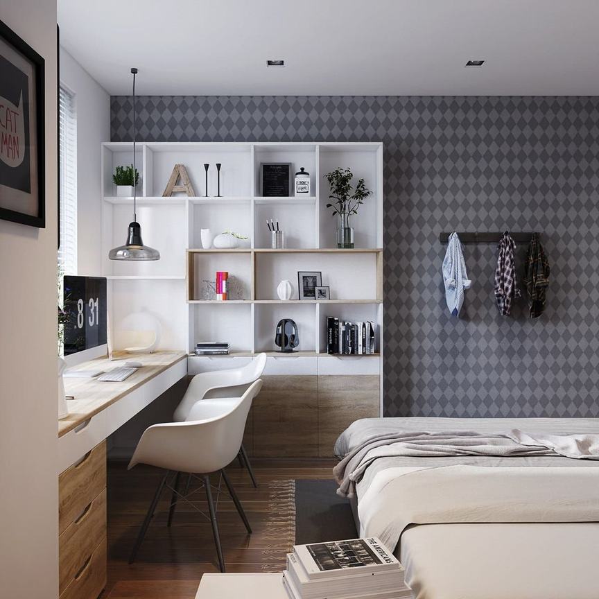 С учетом функционала помещения, следует особенно внимательно отнестись к его меблировке. Обязательными атрибутами данной спальни является кровать, рабочий стол с креслом или стулом и шкаф.