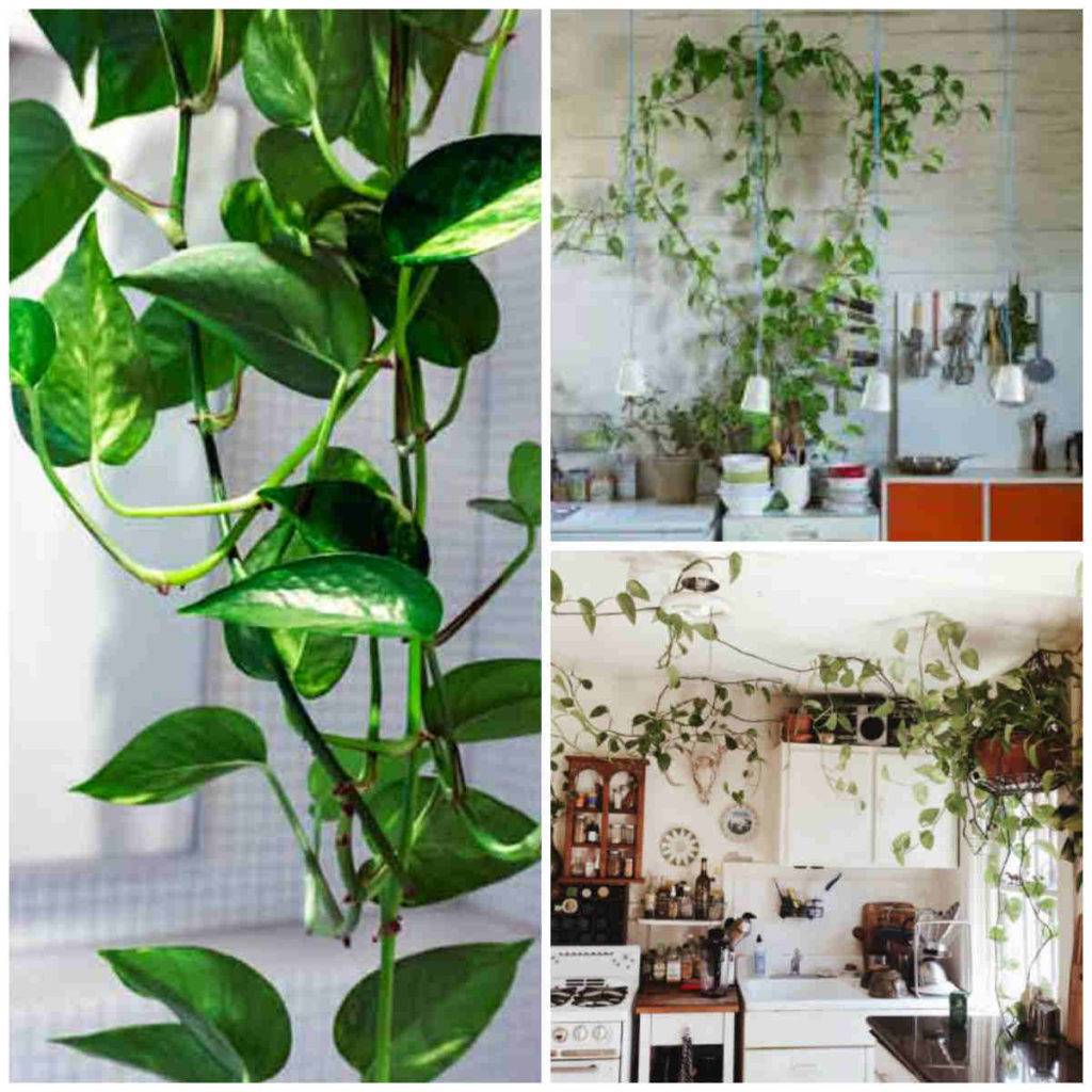 Сциндапсус золотистый или Эпипремнум. Тропическая вечнозеленая лиана очищает воздух, неприхотлива в уходе. Растет в длину до 1,5 м. Может приспособиться в любом месте помещения, а также выносит перепады температур и искусственное освещение, хотя при этом листья становятся полностью зелеными. Место жительства – на кухонном гарнитуре (сверху), буфете, в кашпо.
