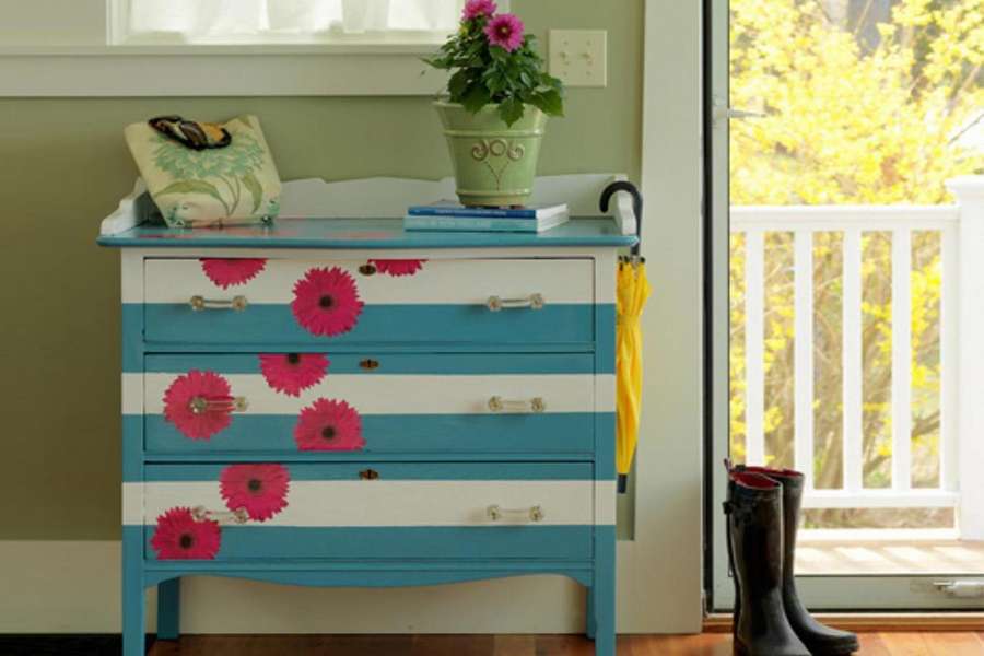 Используйте кисти разной толщины и акриловые краски для создания тонкого и изящного орнамента на поверхности комода. Может даже имитировать гжель с помощью соответствующего оттенка красок.