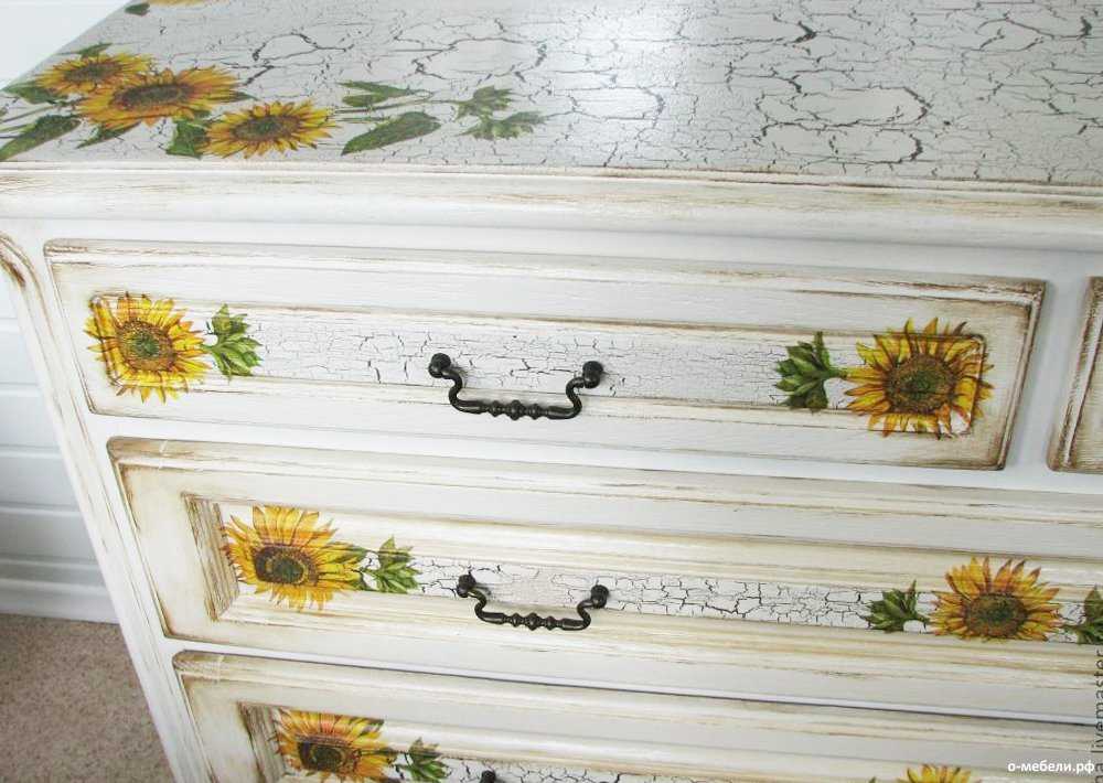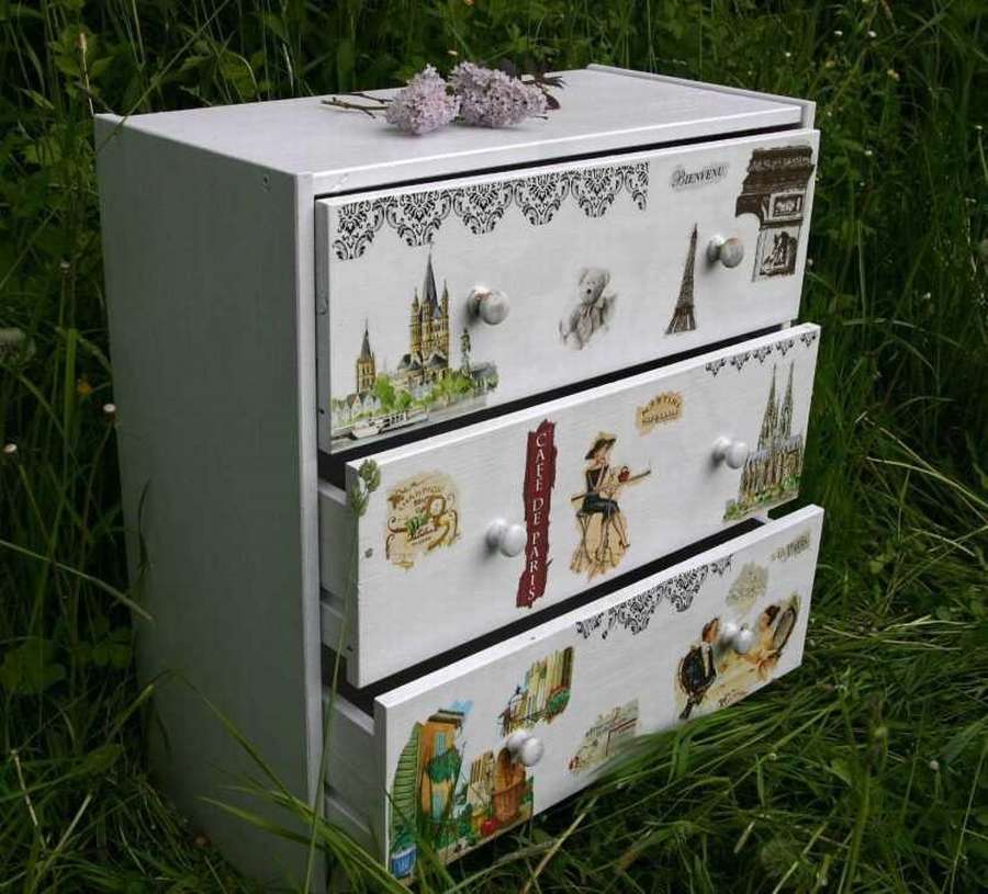 Взгляните, как интересно вы можете обыграть оформление комода с помощью разрисовки боковых стенок ящиков. Обязательно покройте рисунок специальным лаком.