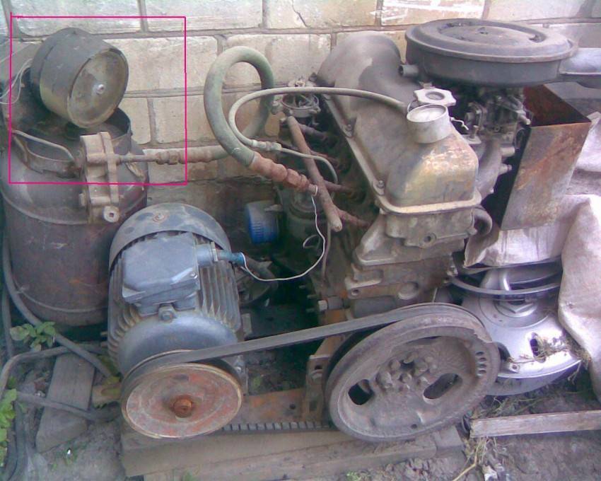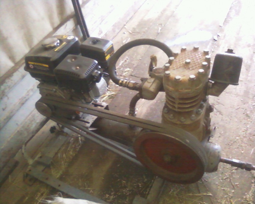 Принципиально другая конструкция у воздушного компрессора, который собирается на базе компрессора ЗИЛ и отдельно стоящего двигателя. Это более мощное оборудование, которое может использоваться и для подключения пневмоинструмента. Очень шумный агрегат.
