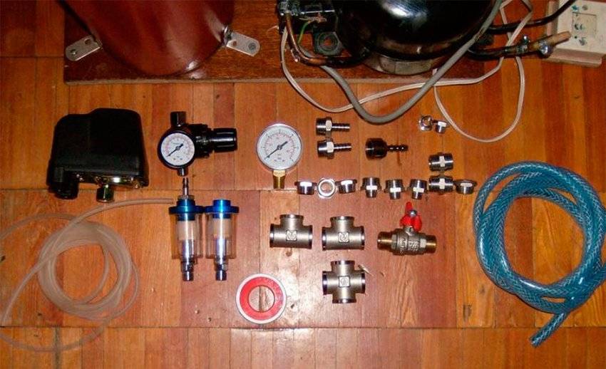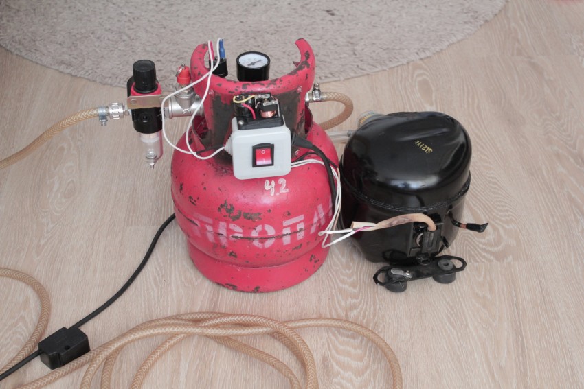 В качестве основных элементов берутся: мотор-компрессор от холодильника (лучше производства СССР) и баллон огнетушителя, который будет использован в качестве ресивера. Если в наличии их нет, то компрессор от неработающего холодильника можно поискать в мастерских по ремонту или в пунктах приёма металла. Огнетушитель можно приобрести на вторичном рынке или привлечь к поискам знакомых, на работе у которых могут быть списанные ОХП, ОВП, ОУ на 10 л. Баллон огнетушителя должен быть безопасно опорожнён.
