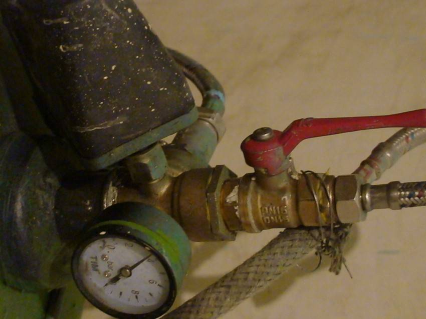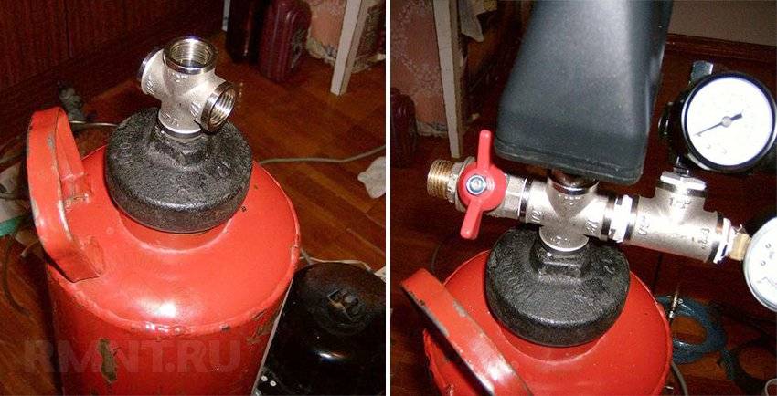 На верхний патрубок крепим реле давления, с одной стороны ввинчиваем тройник и подсоединяем манометр, с другой монтируем предохранительный клапан или вентиль для стравливания воздуха вручную (вариант). Там, где это требуется, используем переходники. При необходимости — красим баллон.