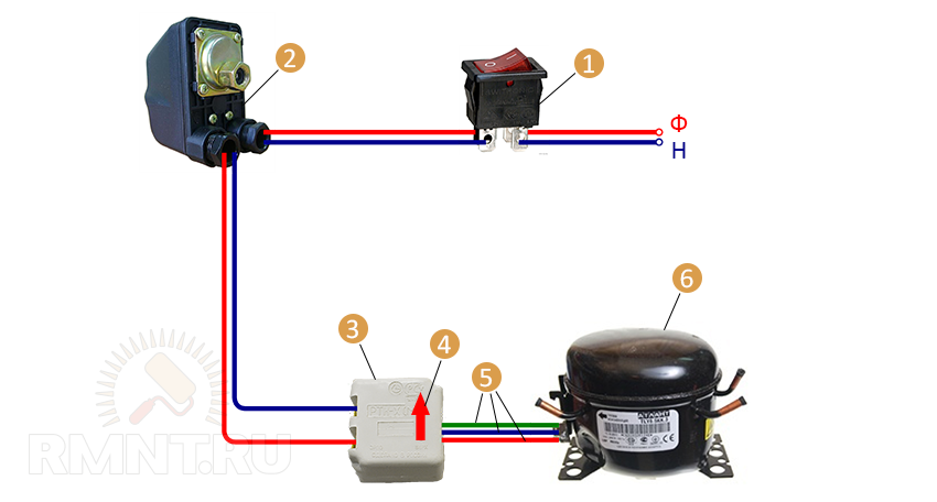1 — тумблер; 2 — реле давления; 3 — пусковое реле компрессора; 4 — стрелка положения реле; 5 — подключение реле к обмоткам компрессора; 6 — компрессор