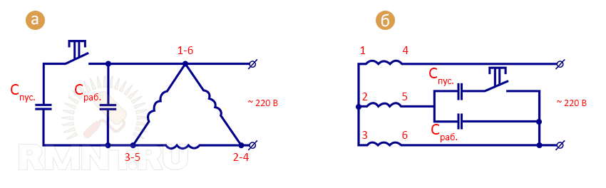 Подключение трёхфазного двигателя в однофазную сеть: а — «треугольником»; б — «звездой»
