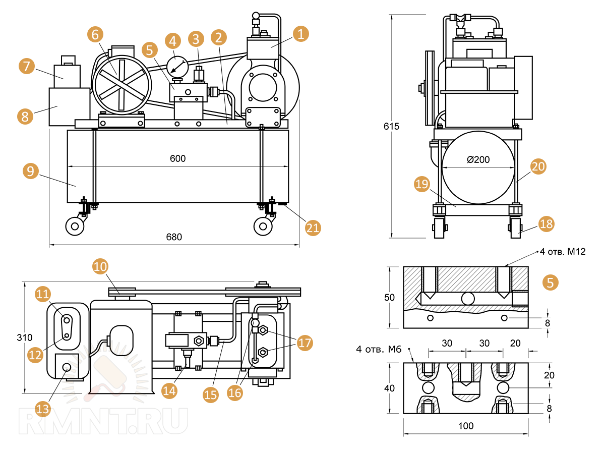 Компоновочный чертёж компрессорной установки: 1 — компрессор от ЗИЛ-130; 2 — рама из уголка; 3 — предохранительный клапан; 4 — стандартный манометр; 5 — коробка раздаточная; 6 — трёхфазный электродвигатель (1 кВт, 1380 об/мин); 7 — коробка пуска (от стиральной машинки); 8 — конденсаторная батарея (ёмкость рабочая — 25–30 мкФ, пусковая — 70–100 мкФ); 9 — ресивер (из кислородного баллона или глушителя КрАЗ); 10 — передача клиноременная (снижение оборотов 1:3); 11 — кнопка «Стоп»; 12 — кнопка «Пуск двигателя»; 13 — кнопка для краткосрочного включения пусковой конденсаторной батареи; 14 — штуцер расходного (выпускного) клапана; 15 — трубки алюминиевые Ø 6 мм; 16 — клапаны выпускные; 17 — клапаны впускные; 18 — колёса (4 шт.); 19 — поперечное ребро жёсткости; 20 — шпилька стяжная (М10 — 4 шт.); 21 — сливное отверстие с пробкой
