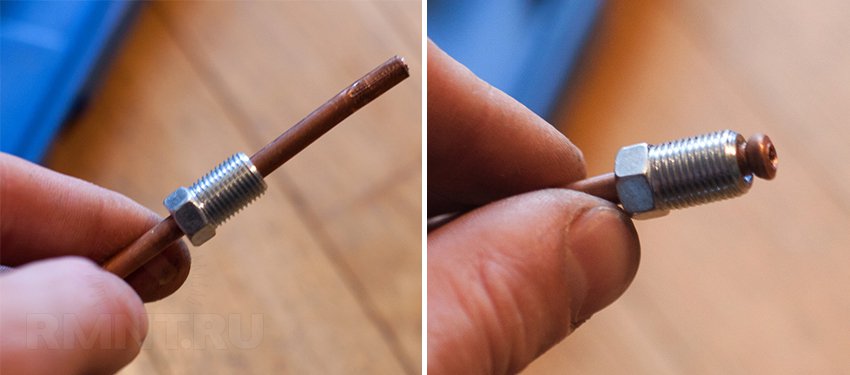 Далее нужно аккуратно спилить или отрезать запаянный конец, следя, чтобы медные опилки не попали внутрь трубки. Затем слить имеющееся внутри масло и с помощью шприца залить моторное, синтетическое или полусинтетическое. Загерметизировать трубку можно, подобрав винт подходящего диаметра, который нужно обмотать ФУМ-лентой и ввинтить в отверстие. Поверх соединения можно нанести герметик. Если нужно — окрашиваем поверхность эмалью.
