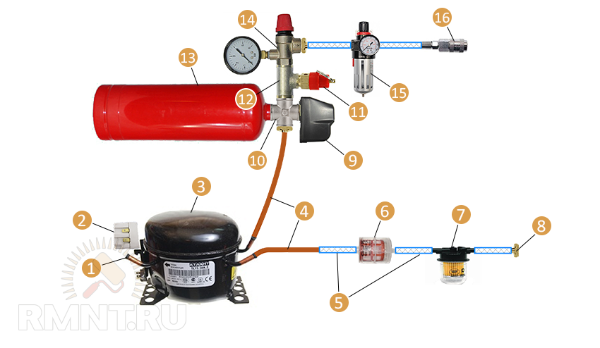1 — трубка для заливки масла; 2 — пусковое реле; 3 — компрессор; 4 — медные трубки; 5 — шланги; 6 — дизельный фильтр; 7 — бензиновый фильтр; 8 — вход воздуха; 9 — реле давления; 10 — крестовина; 11 — предохранительный клапан; 12 — тройник; 13 — ресивер из огнетушителя; 14 — редуктор давления с манометром; 15 — влагомаслоуловитель; 16 — пневморозетка