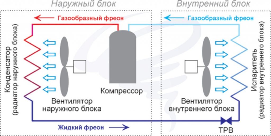 Внутри герметично закрытого контура циркулирует хладагент (фреон — вещество с очень низкой температурой кипения). Функция любого кондиционера заключается в теплообмене между помещением и улицей.