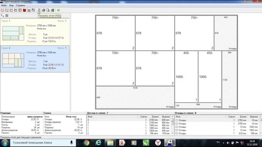На завершающем этапе делают карту раскроя. Для раскроя деталей подходит приложение Cutting 2. Оно позволяет рационально расположить детали на материале, уменьшить отходы, а, значит, и затраты. У программы простой и понятный интерфейс, в ней можно отметить детализацию (например, обработку торцов полимерной кромкой).