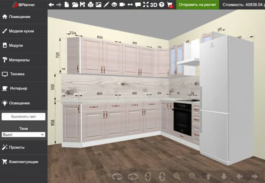 Наиболее быстрый и примитивный софт, доступный в режиме реального времени. Легко воссоздает простой проект кухни. Изображение доступно в двух- и трехмерном формате. Его можно развернуть любой стороной.