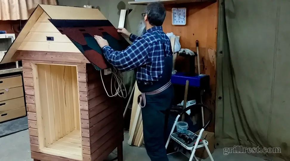 Деревянную крышу можно покрыть шифером или другим кровельным материалом, чтобы защитить строение от осадков. Вытяжная труба обычно изготавливается из деревянных брусков или металлического листа.