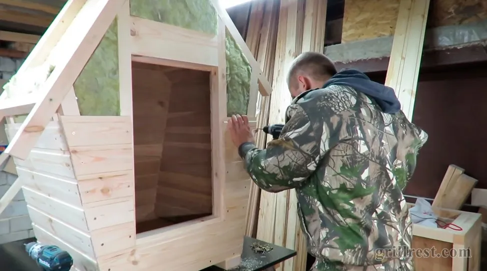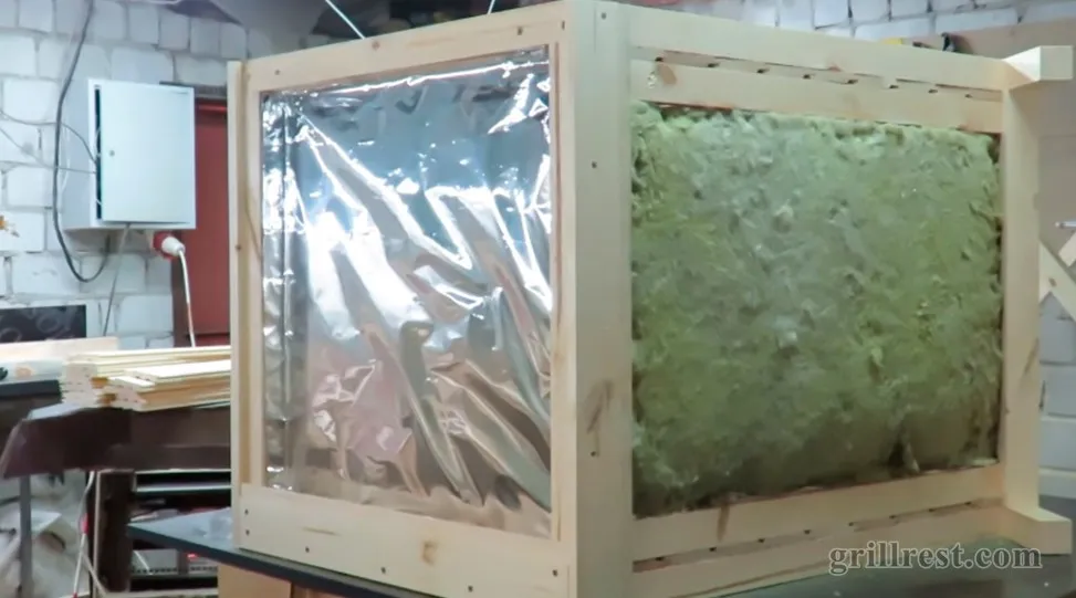 Повысить теплоизоляционные свойства коптильной камеры поможет внешняя обшивка корпуса вагонкой или фанерой. Между стенками укладывается фольгированный утеплитель для создания эффекта термоса. Каркас для дверей также обивается с двух сторон вагонкой или фанерным листом.