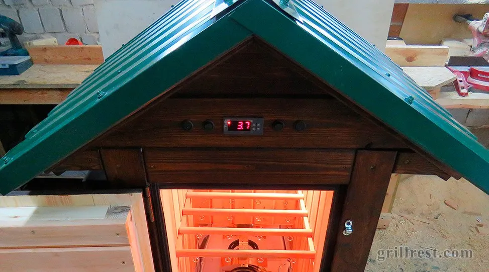 Термометр или термостат нужен для того, чтобы поддерживать заданную температуру. По желанию можно установить вентилятор. Он пригодится для подвяливания и сушки продуктов.