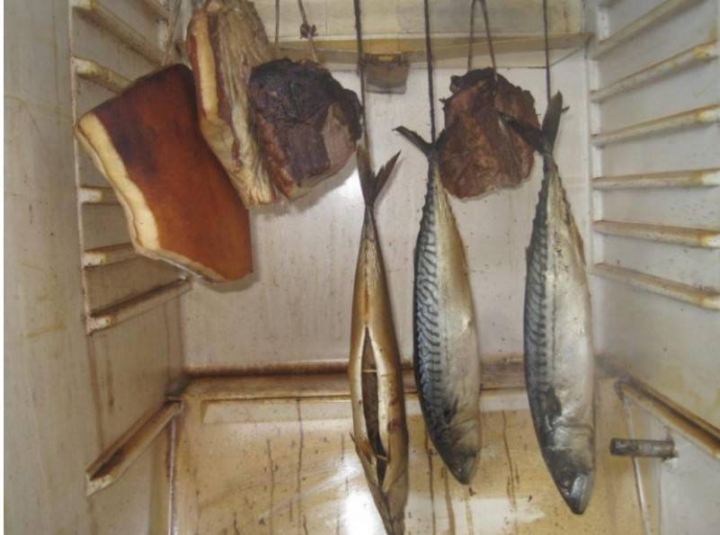 В боковую часть ящика вставляется вентилятор небольшого размера. Предварительно засоленные продукты подвешиваются в самодельный шкаф. Стоит отметить, что чем сильнее будет поток воздуха, тем меньше времени понадобится на сушку будущих копченостей.