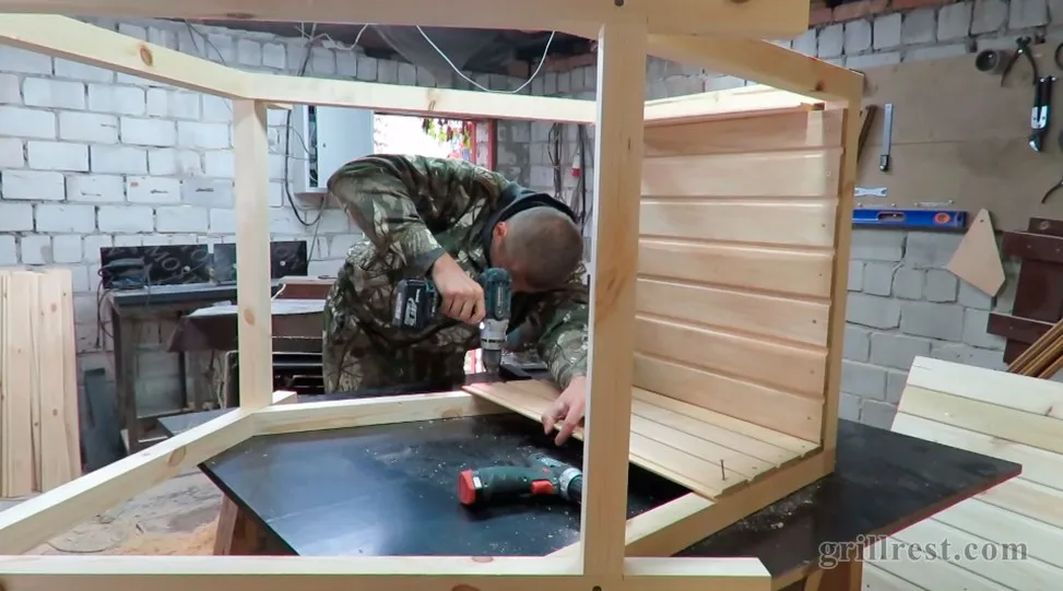 В первую очередь собирается каркас из вертикальных и горизонтальных брусков. На боковых сторонах корпуса следует предусмотреть перекладины, на которые в дальнейшем будут размещаться решетки для укладки продуктов. В нижней части камеры эти перекладины понадобятся для установки поддона, чтобы собирать жир.