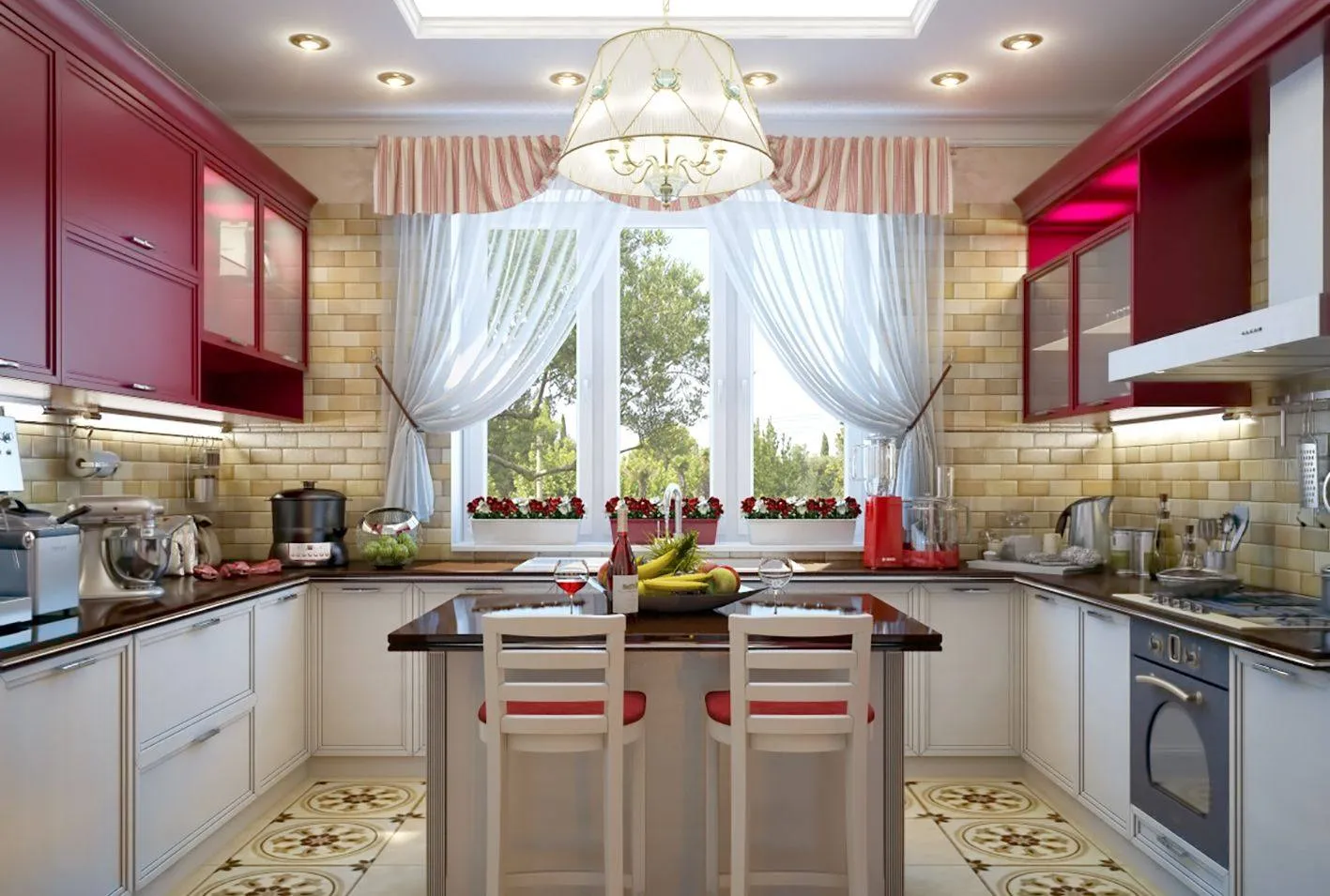 Если у вас маленькая кухня с низкими потолками, рекомендуется выбирать короткие шторы, чтобы создать визуальное ощущение большего объема и света.