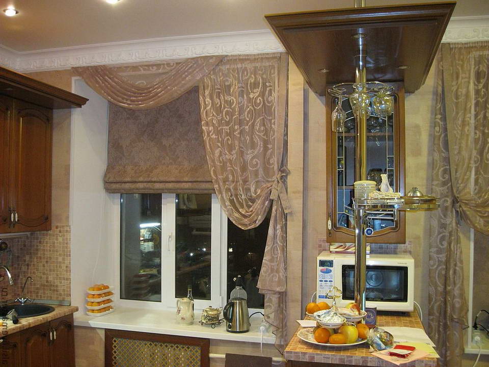 Когда будете определяться со стилем занавесок, учитывайте общий интерьер кухни. Встречаются классические варианты, которые представляют собой шикарные гардины. Они имеют много складок.