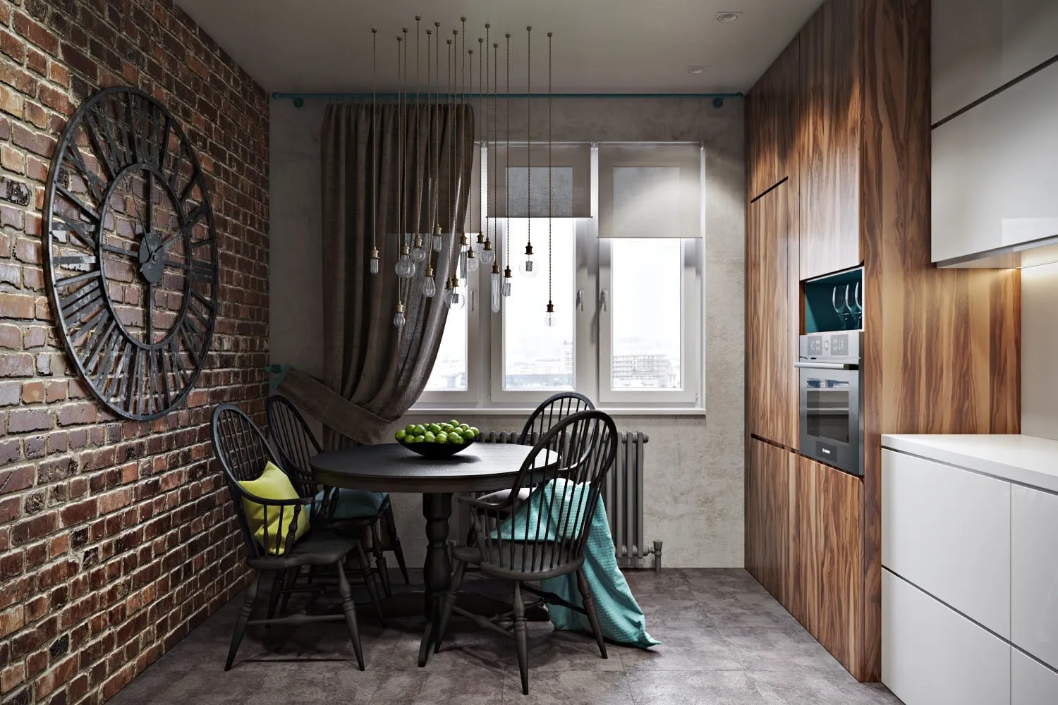 Оборки, кружево, драпировки и бахрома недопустимы. Следует отказаться от ярких цветов, вычурных узоров и броских аксессуаров. Простота и натуральность — главные принципы выбора оформления окна в кухню стиля лофт.