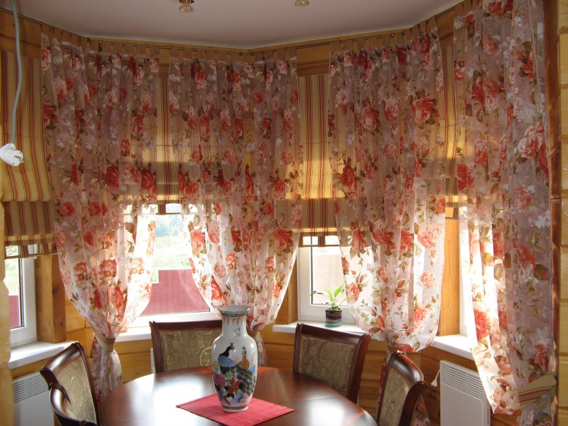 Не в новинку, но весьма популярны эркерные шторы. Их удобно применять, когда оконный проем фигурной формы.