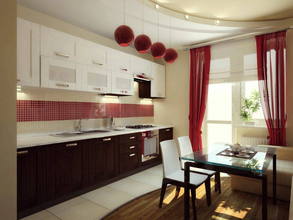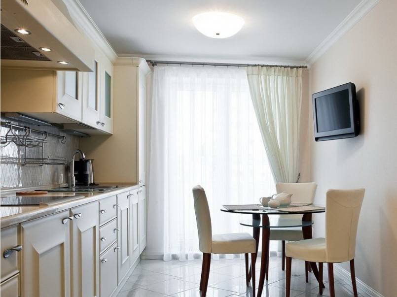 В небольших по площади помещениях следует отдавать предпочтение коротким занавескам, которые не будут воровать все свободное пространство, а только лишь визуально подчеркнут миниатюрность небольшой кухни.