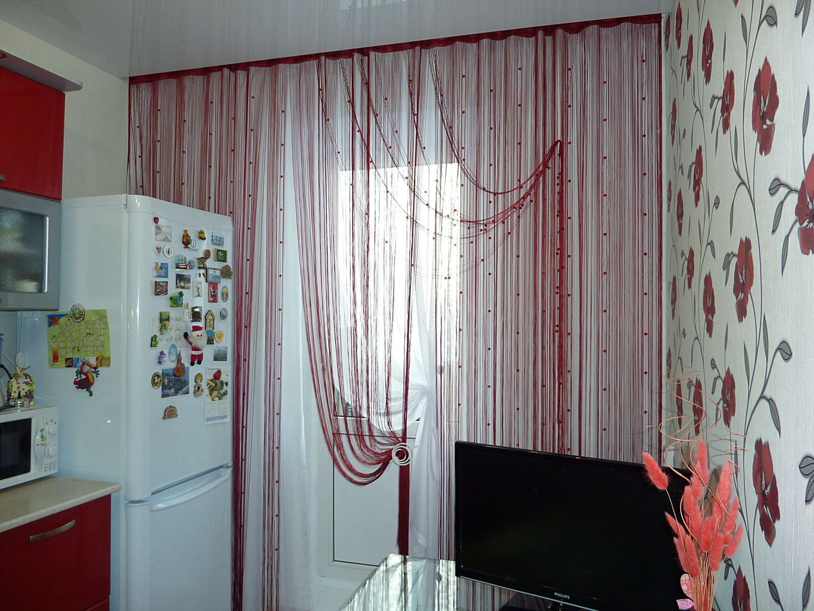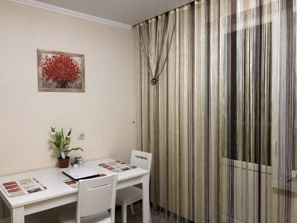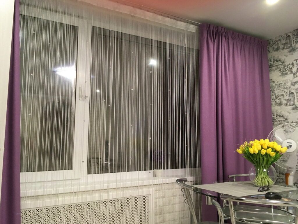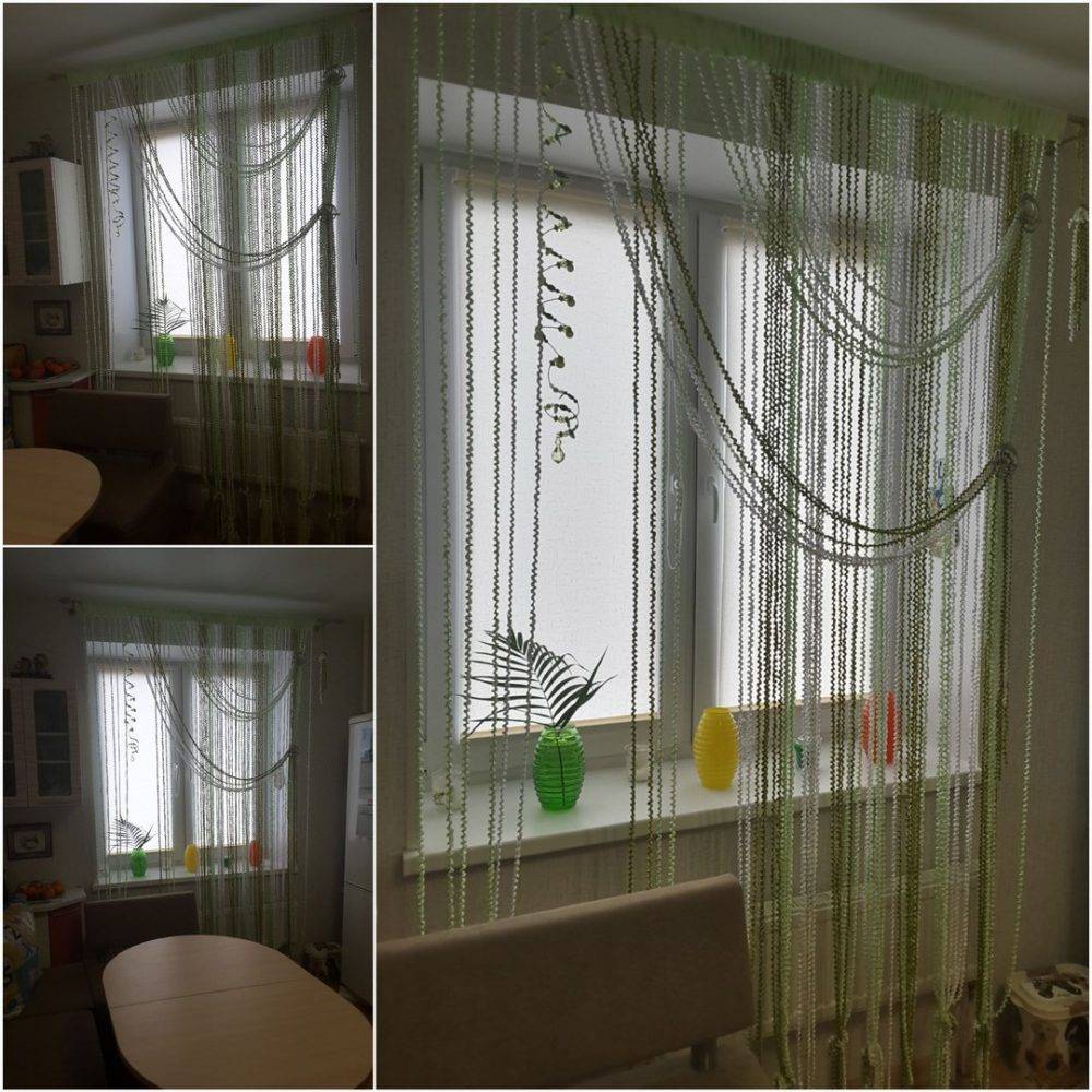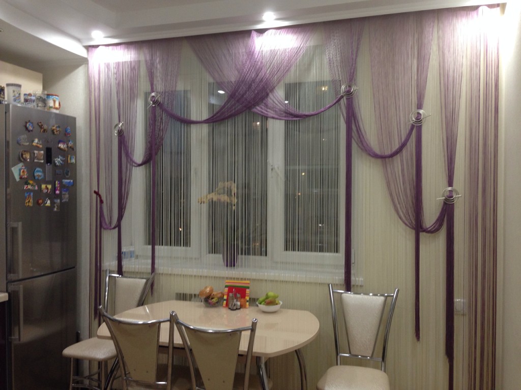 Такие шторы практично использовать именно на кухне. Выглядит кисея изысканно, способна вписаться в любой интерьер, не требует специального ухода. Данная форма занавесок пришла из восточных стран. Там красивые цветные нити затеняли комнаты, но не препятствовали движению воздуха. Украсить нити кисеи можно бусинками, стеклянными шарами. На солнце они переливаются, создавая впечатление праздника.