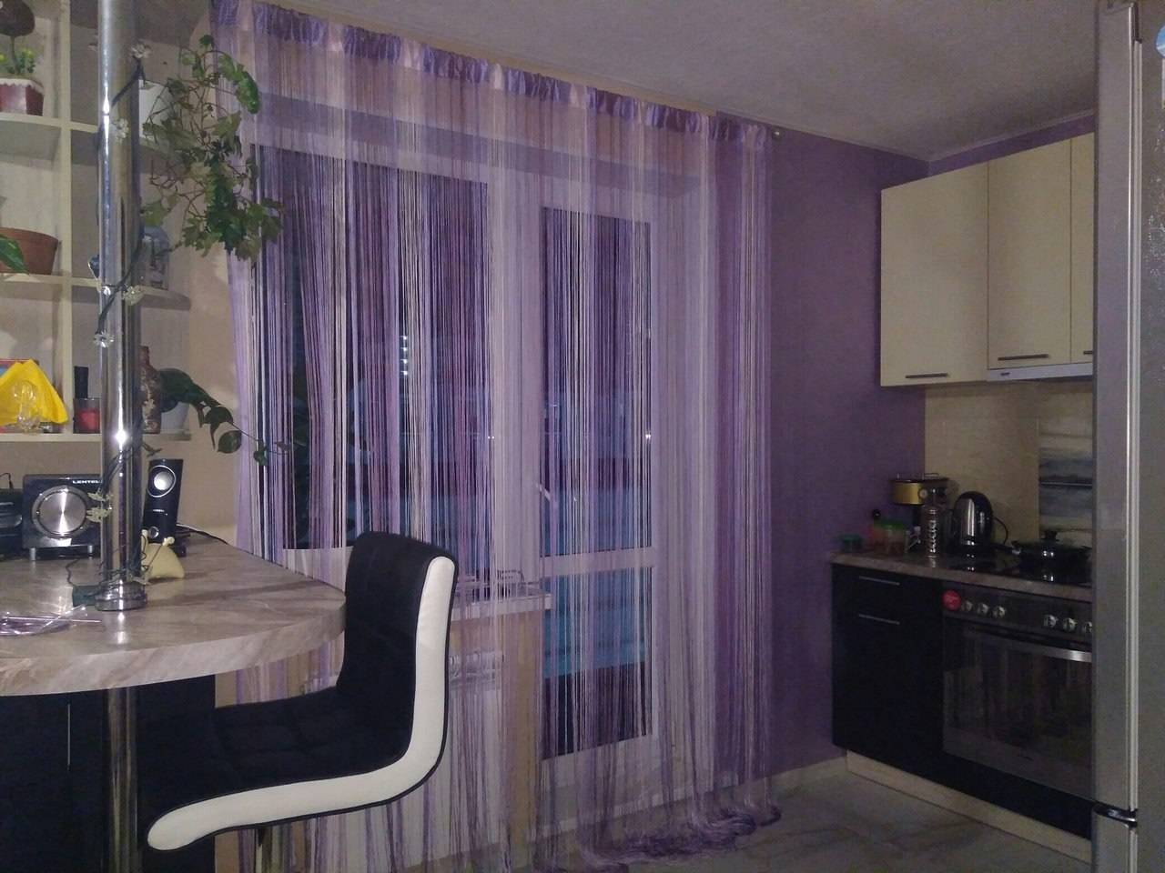 На кухню с балконной дверью можно использовать тюль, варианты которого представлены на фото