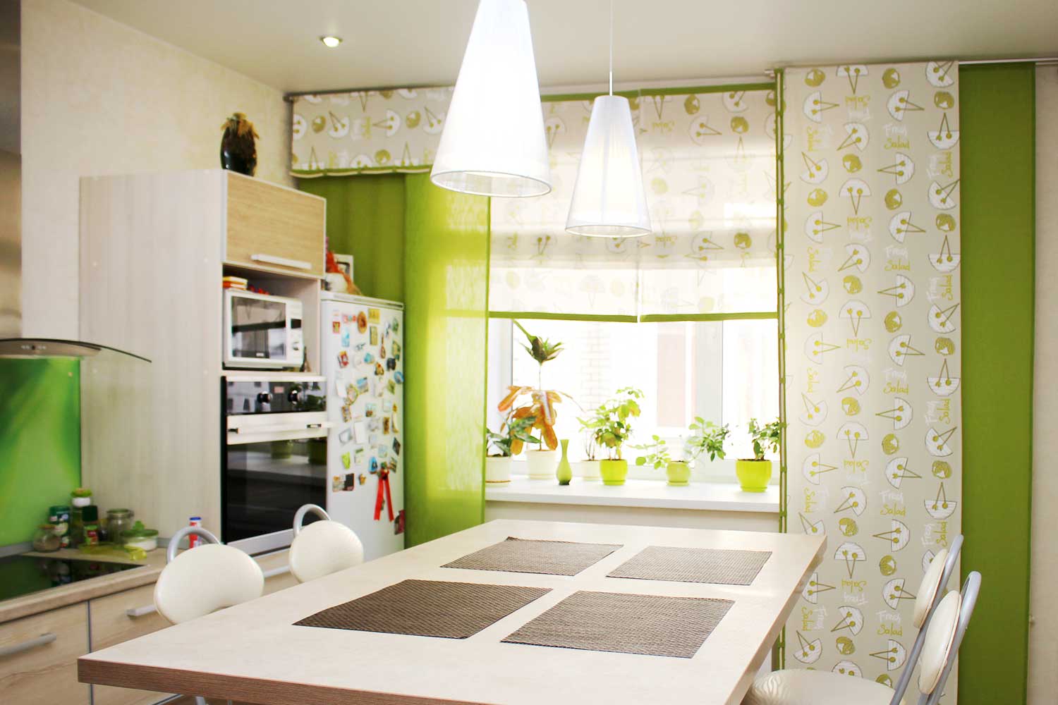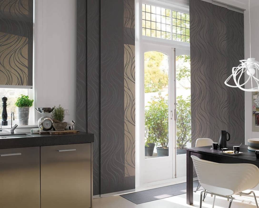 Любителям изысканного, но строгого стиля дизайнеры предлагают новинку 2022 года – японские шторы для кухни. У них выраженные правильные формы с рисунком или покрытием одного тона. Такие шторы подойдут для ровных стен и потолков с ровными углами.