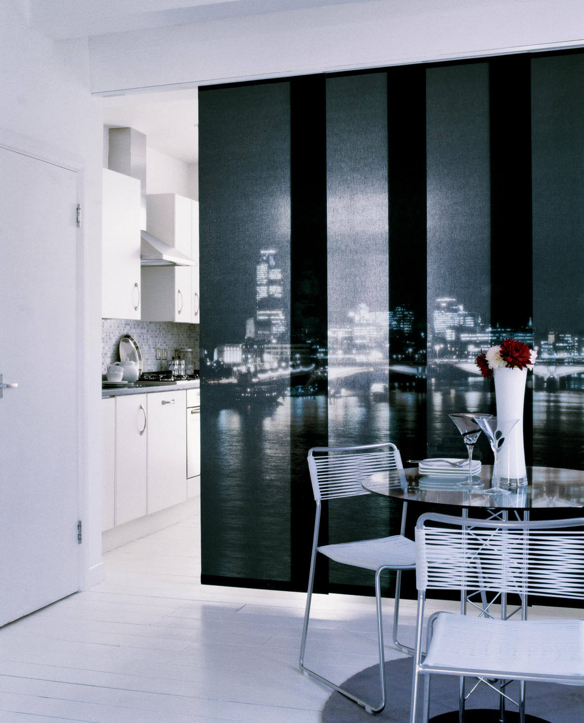 Японские экранированные шторы давно вышли за пределы азиатской стилистики. Оригинальные решения используются не только по прямому назначению, но и чтобы скрыть простенки между чередующими окнами, например, если кухня с эркером.