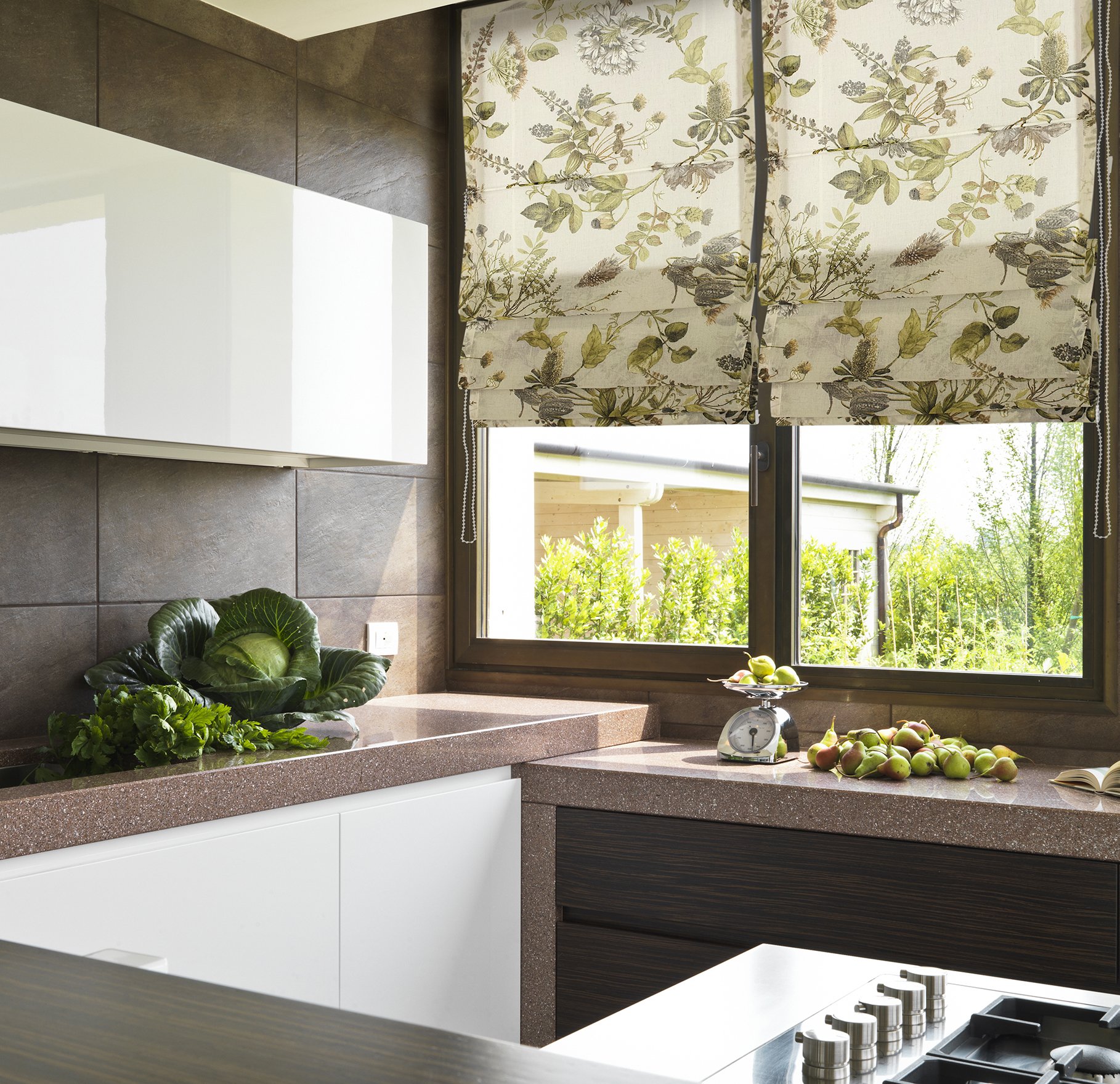 Римские шторы чудесно сочетаются с тюлем или с ламбрекеном, что дает возможность охватить и практическую, и эстетическую сторону оформления. Они защитят от солнца внешние окна кухни с балконом, в то время как внутренние можно будет оформить совершенно по-другому, ни в чем себе не отказывая.