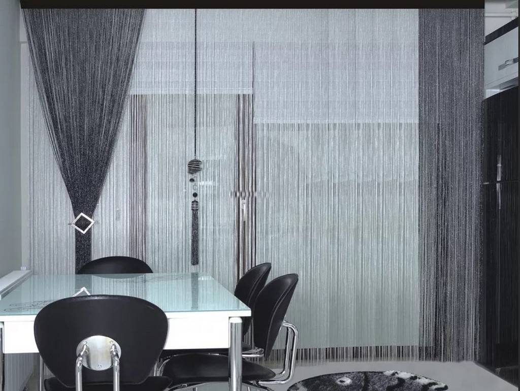 Идеальной заменой классического тюля считаются шторы-кисея, состоящие из тонких нитей, или шторы-лапша, выполненные из лент. Оба варианта уместно украсить с помощью декоративных элементов: бусин, пуговиц.