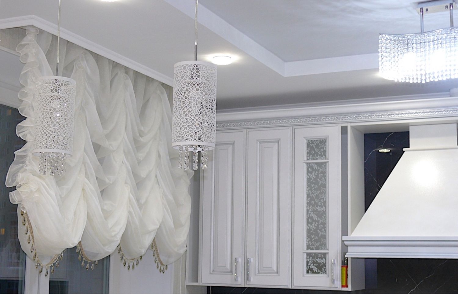 Шторы-кисея гармонично вольются в любой дизайн, например, классический, минимализм, восточный, хай-тек. На большой кухне такими шторами можно разграничить зоны приготовления пищи, столовую.