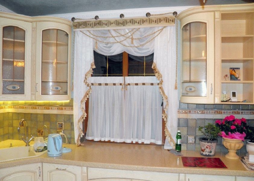 Комбинированный ламбрекен сочетает в себе жесткий и мягкий варианты, выглядит богато и солидно. Такое оформление лучше оставить для просторной кухни в стиле барокко, модерн или для классического помещения. Нужно помнить, что многослойные шторы на кухне считаются неподходящим вариантом в плане противопожарной безопасности. Поэтому многослойные портьеры должны находиться далеко от газовых плит.