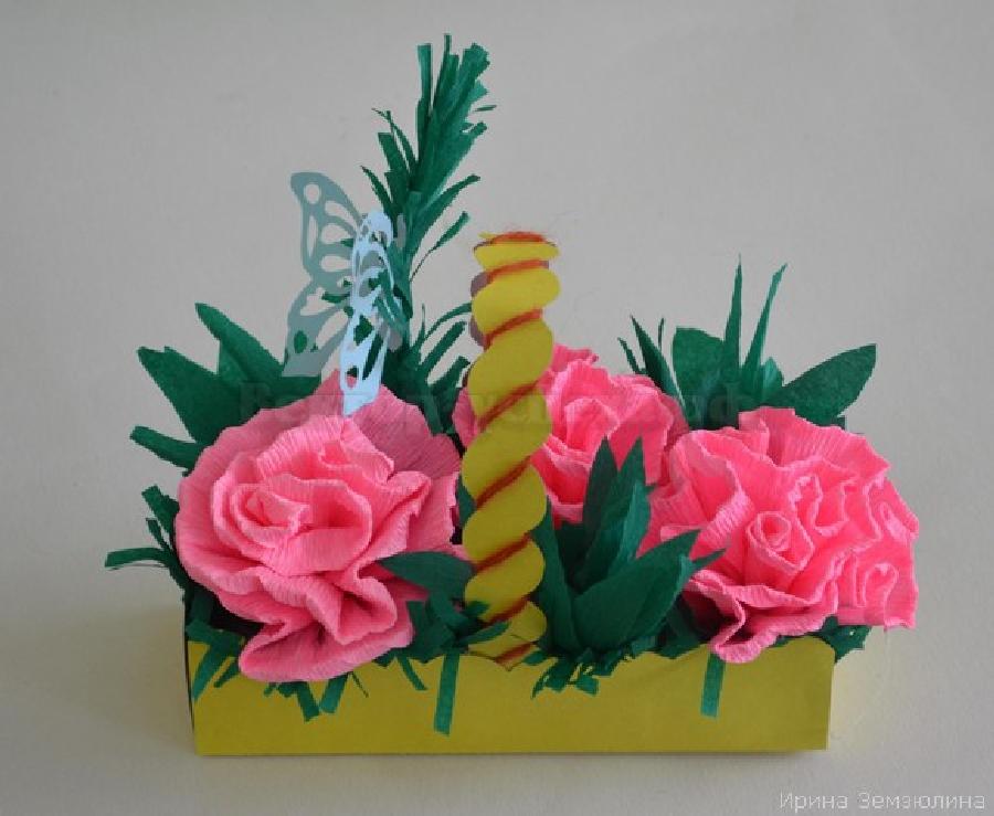 Часто мы дарим цветы на 8 марта любимым женщинам. Такую корзинку из бумаги с цветами можно сделать и на детский конкурс в школе, и подарить близким. Для его выполнения потребуется гофрированная бумага и картон. Мы так же прикрепили схему кустиков, которые должны получиться. В данную поделку можно так же добавить ленты или конфеты в сердцевину цветов.