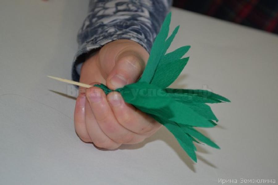 - Затем в работу включить бумажную лозу. Заготовку перегнуть пополам и ее кончик разместить в месте образования креста.