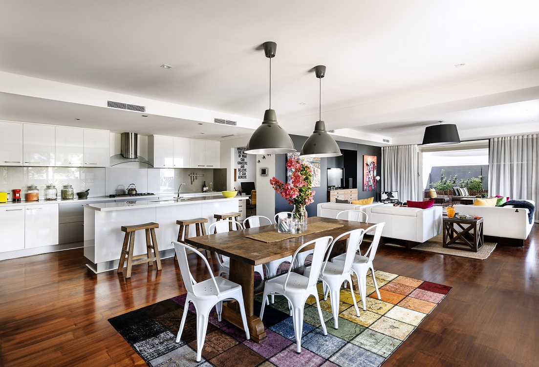 - Зонирование. Обеденная зона всегда более уютная, в отличие от функциональной — почему бы не использовать под столом уютный ковер, чтобы еще больше отделить столовую от рабочей зоны.