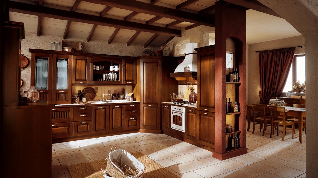 Их дополняют резными деталями и коваными элементами, что придает кухне необходимый деревенский колорит, гарнитуром с открытыми полками, на которые можно разместить керамические аксессуары, горшки с цветами.