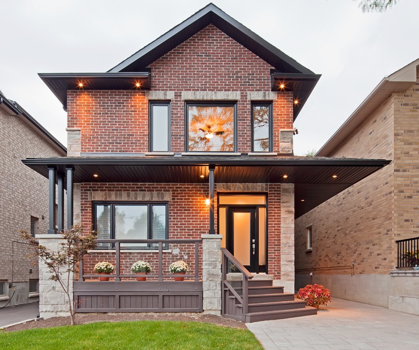 В качестве декоративной отделки фасада дома часто выбирают кирпич, ведь смотрится он довольно презентабельно. Такой фасад делает дом визуально больше по размеру.
