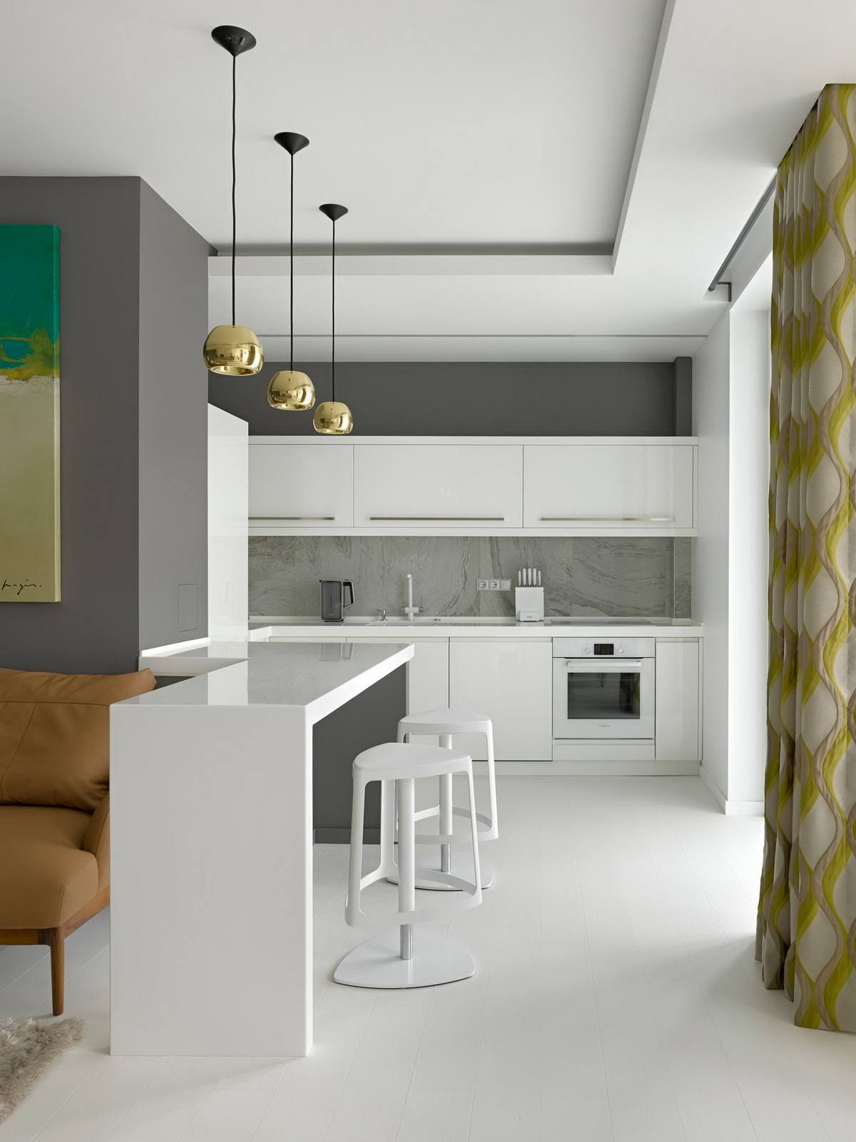 Идеальный вариант для тех, кто ценит простоту, функциональность и элегантность. Обустроить такое помещение довольно просто, для отделки стен можно использовать любые материалы: штукатурку, моющиеся обои, гипсовые панели, керамическую плитку. Светлые тона наполнят кухню легкостью, сделают ее более просторной.