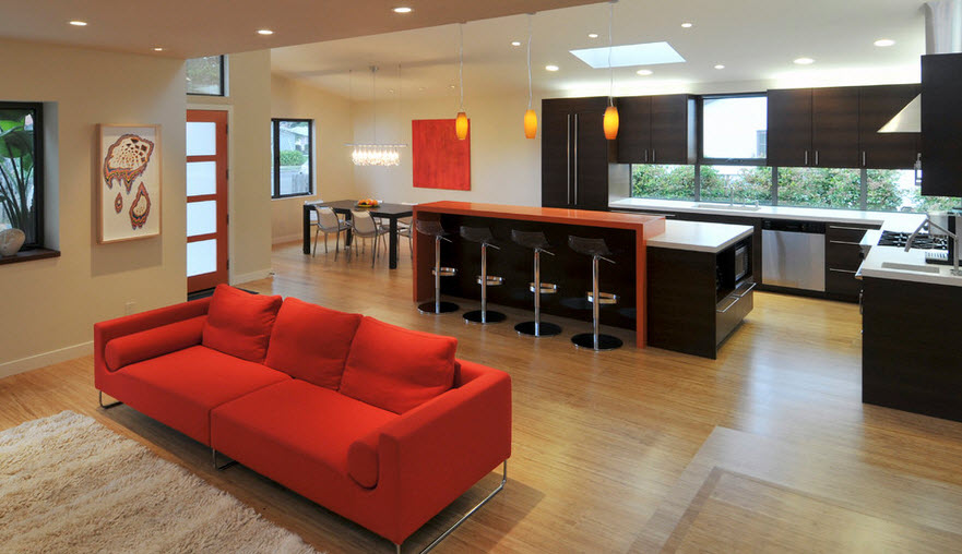 Самым удачным применением красного гарнитура является его размещение в кухнях-столовых или квартирах-студиях. В этих случаях кухонный гарнитур становится основным предметом интерьера, вокруг которого строится дизайн помещения. Яркость и насыщенность цвета оправдывается его доминантным статусом.