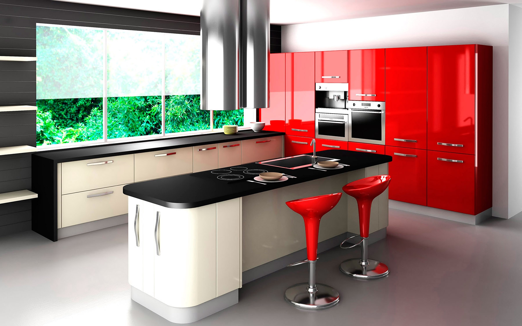 Дизайн красно — черной кухни в сочетании с третьим цветом