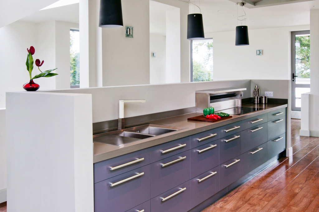Все должно быть лаконично и просто: четкость и строгость линий фасадов, фурнитура из хромированной стали, минимум декоративной отделки.
