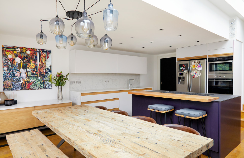 Бело-фиолетовая гамма создает на кухне уникальный шарм. Цвет мистиков и магов, этот волшебный оттенок способен снижать аппетит и восстанавливать душевное равновесие. При оформлении кухни в такой палитре лучше не использовать насыщенный фиолетовый в больших количествах – он может вызывать чувство беспокойства.