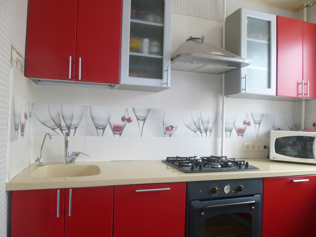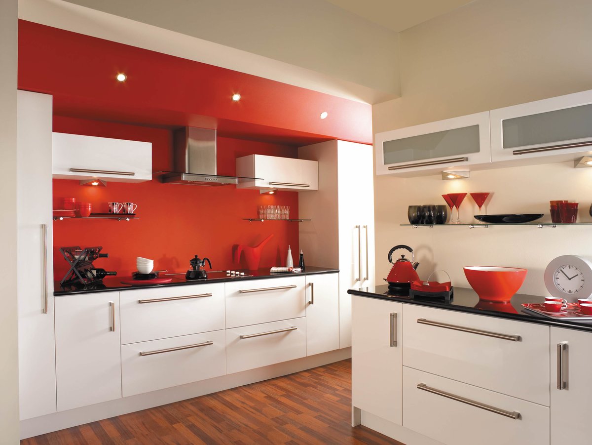 Если гарнитур на кухне светлый, то стены оформляют красным цветом следующим образом: