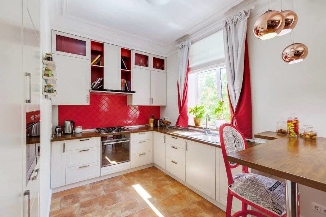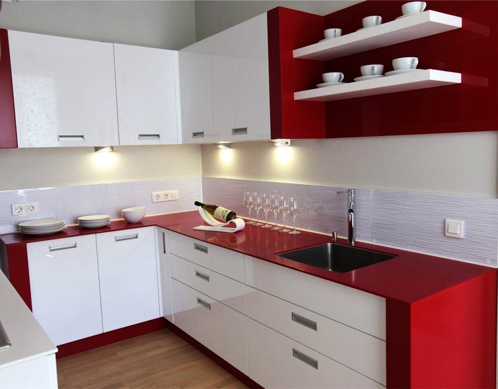 При оформлении интерьера тесного кухонного помещения, площадью всего шесть-восемь метров квадратных, важно постараться не сделать его еще меньше. Для этого используются зеркала и глянцевые мебельные фасады, яркое освещение и минимальное присутствие декора. Красные оттенки делаются максимально светлыми, близкими к розовому, оранжевому