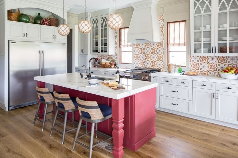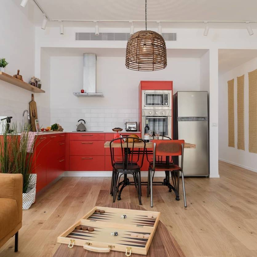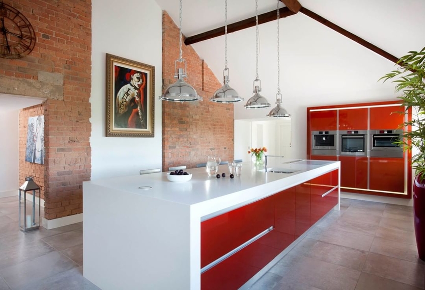3. Единичный акцент. Красный акцент в обстановке может быть и одним-единственным (холодильник, фартук, угловой шкаф гарнитура, диван, обои на акцентной стене, кухонный остров).