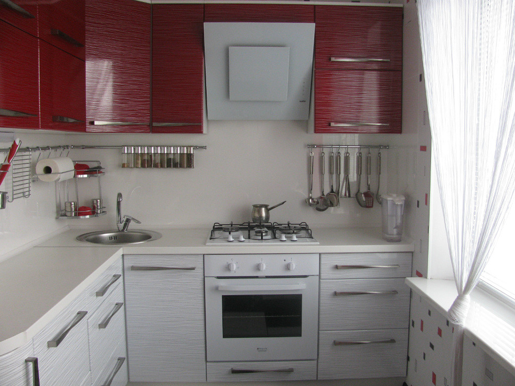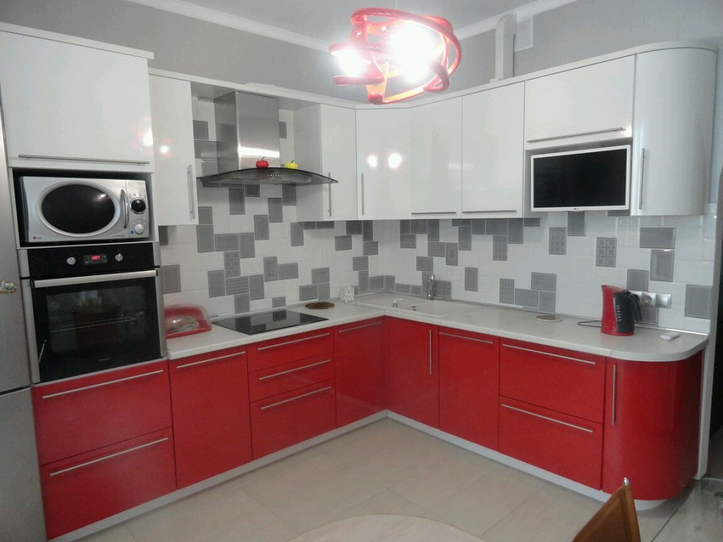 Выбирая кухонный гарнитур, рекомендуется отдать предпочтение модели с красным низом и белым верхом, с серыми столешницами. В сером цвете также должна быть выполнена вся бытовая техника. Этот вариант можно использовать при обустройстве кухни средних размеров.