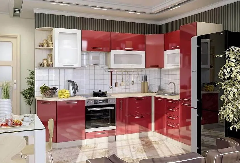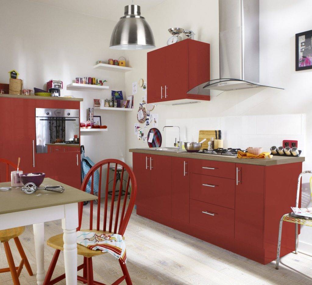 Если отделка стен имеет нейтральный цвет, то вполне допустим красный кухонный гарнитур