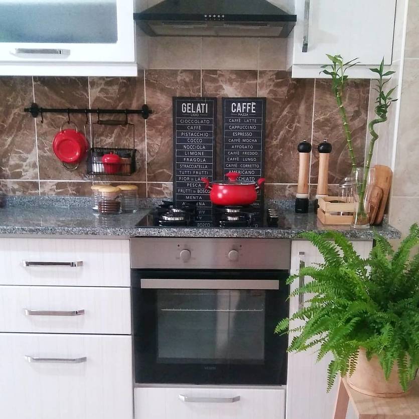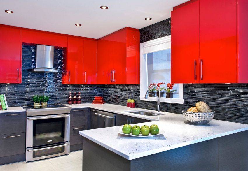 Фартук изготавливают из керамической плитки, скинали, или закрывают стену защитным стеклом. Хорошо смотрится плитка в форме кирпичей, мраморные поверхности в любом из ахроматических тонов, имитация камня. Необычно смотрится красный фартук, под такие же фасады, но если яркий цвет будет постоянно находиться на уровне глаз, он быстро надоест. Как альтернативу можно выбрать бордовый мрамор – нетривиальное и элегантное решение.